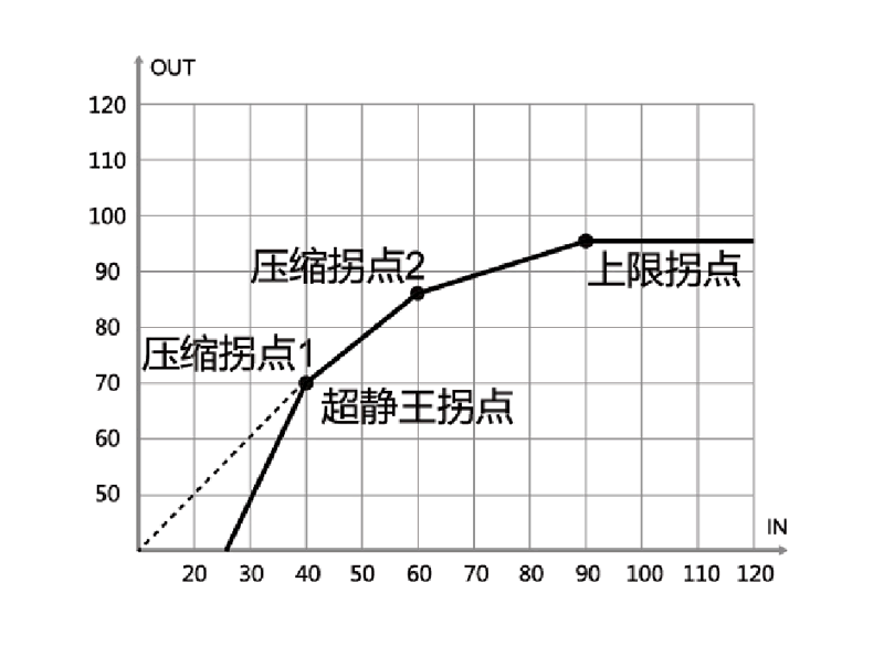 DDRC是在WDRC基础上,在动态范围内增加大声压缩处理。每个通道均具有两个输入拐点及压缩比进行控制调节,以及一个输出限制拐点可调。扩展了更宽频响范围的可听度和舒适度,获取更丰富语音信息、享受舒适聆听。