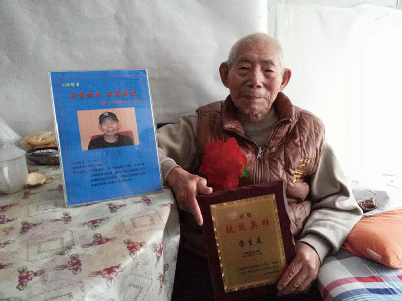 雷老——生于1918年,1938年参军,抗日老兵。曾参加台儿庄战役。是长春市仅存的五位抗日老兵之一。