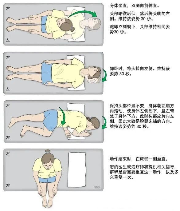 在床头放一个枕头。坐在离枕头足够远的地方,以便躺下时其位于肩部而非头部下方。坐在床上,双腿前伸。两侧留出空间,以防向左侧翻身时坠床。头稍微向后仰,并向右侧转动45°,即直视前方与侧视右肩的中间角度。保持这一体位30秒。迅速躺下,头部位置不变,保持30秒。仰卧时,向左转头。此时头部应略微后仰,左转45°,即直视前方与侧视左肩的中间角度。保持这一体位30秒。现在保持头部位置不变,翻身成左肩侧躺,使面部几乎朝下,左臂位于身体下方。头部应仍位于直视前方与侧视左肩的中间角度。保持这一体位30秒从床边坐起来。向医生或理疗师咨询重复运动的时间和频率。