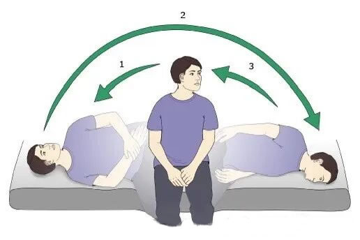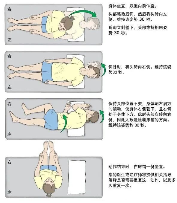 在床头放一个枕头。坐在离枕头足够远的地方,以便躺下时其位于肩部而非头部下方。坐在床上,双腿前伸。两侧留出空间,以防向左侧翻身时坠床。头稍微向后仰,并向右侧转动45°,即直视前方与侧视右肩的中间角度。保持这一体位30秒。迅速躺下,头部位置不变,保持30秒。仰卧时,向左转头。此时头部应略微后仰,左转45°,即直视前方与侧视左肩的中间角度。保持这一体位30秒。现在保持头部位置不变,翻身成左肩侧躺,使面部几乎朝下,左臂位于身体下方。头部应仍位于直视前方与侧视左肩的中间角度。保持这一体位30秒从床边坐起来。向医生或理疗师咨询重复运动的时间和频率。